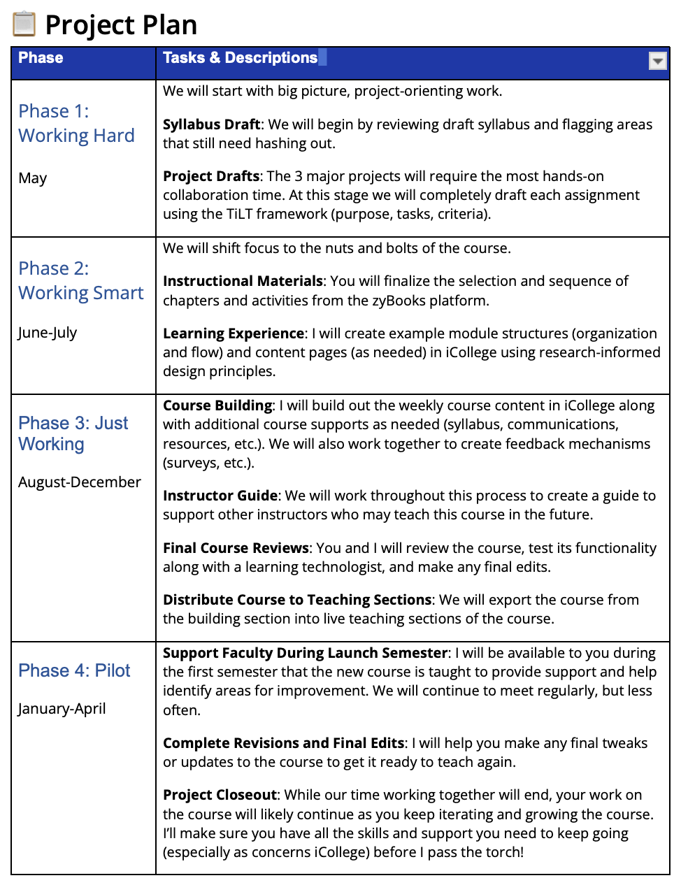 Scheduling was tricky for this project. I quickly realized I would only have a short window (May) where I would have all my partners’ full attention before they started peeling off for travel and other obligations, and even though the course wouldn’t launch until spring, my focus would be have to shift to other projects in the fall. Given these restrictions, I leaned heavily on a Backwards Design approach. We dove straight into drafting the 3 major projects because I those tasks would benefit the most from the immediacy of dialogue in meetings, while tasks like deciding on the scope and sequence of textbook chapters could be accomplished through asynchronous feedback.