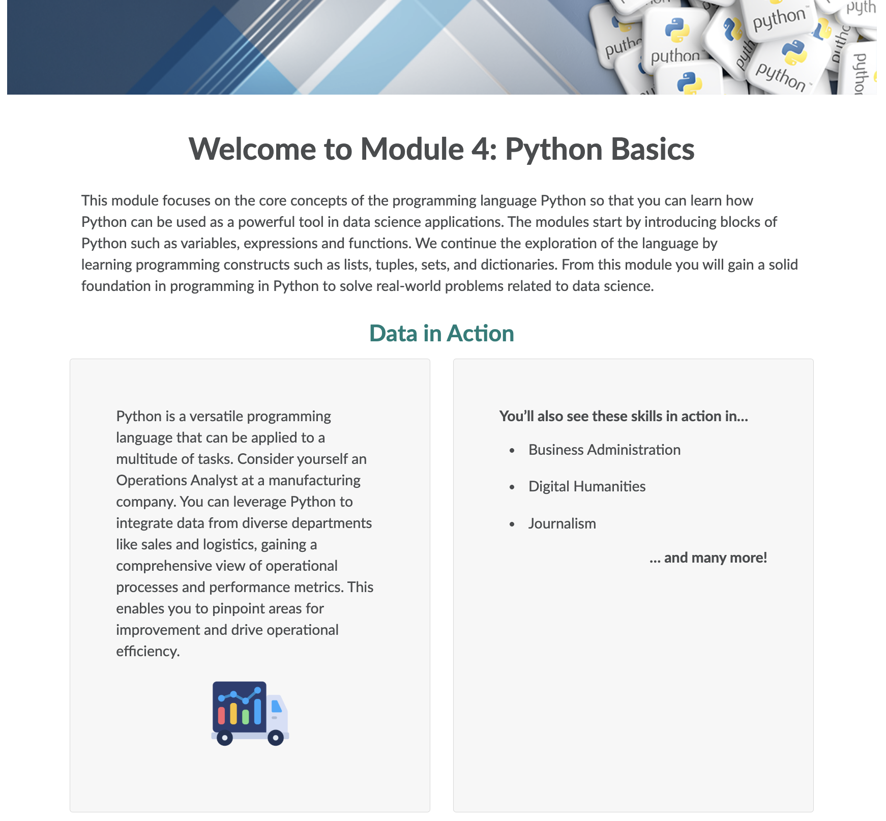 Since this course was aimed at a different student population than these faculty were used to teaching (basically everyone but computer science majors), we knew we needed to make an extra effort to make sure that students saw themselves, and their futures, in this course. One way we tried to connect with students was with constant examples of how people used data skills across a range of careers; we called these features “Data in Action” and we included them in every module overview.