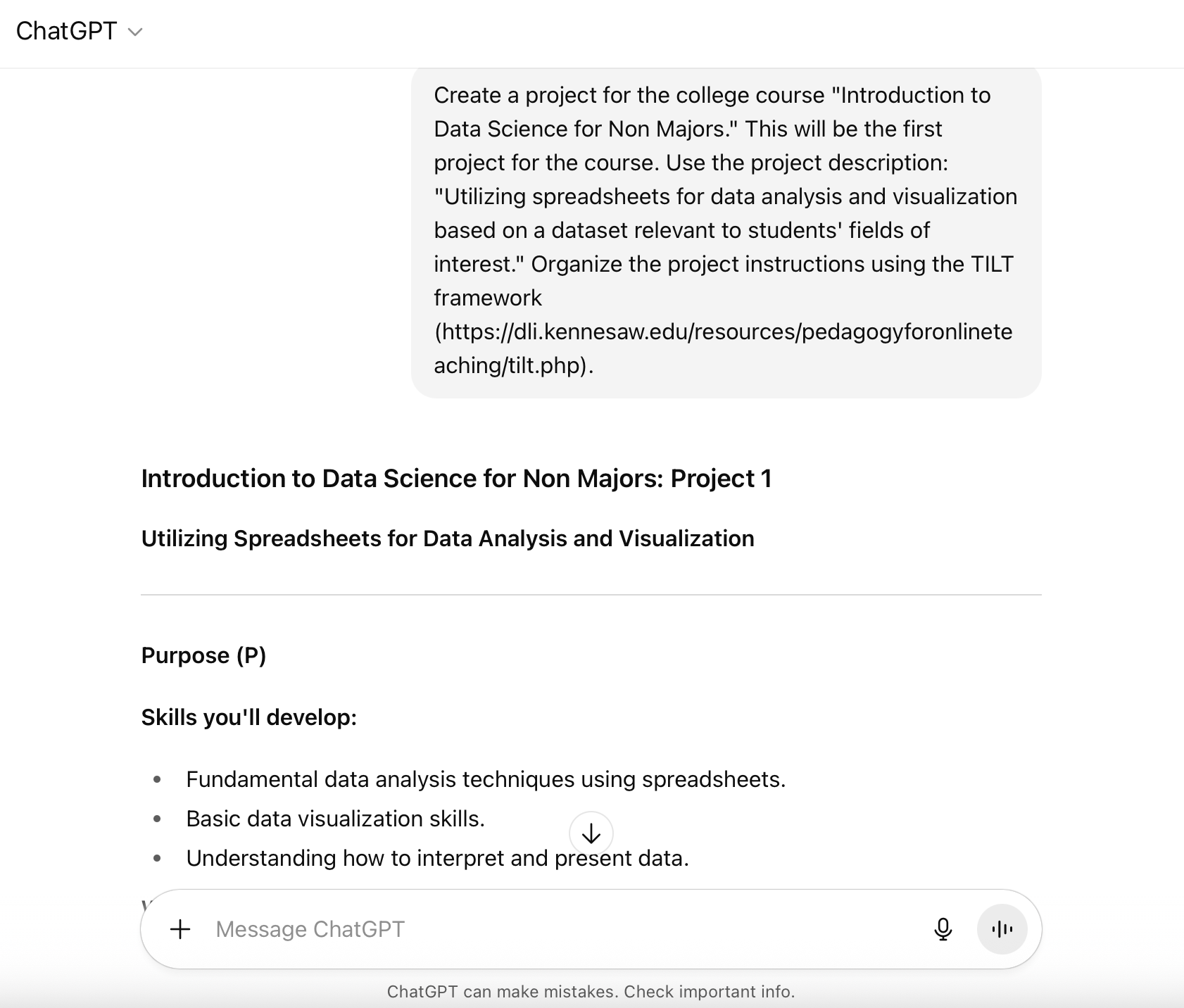 I used high level (1-2 sentence) project descriptions from the syllabus and known course context (course title, college level, non-majors, approximate position in course sequence) to engineer a prompt for ChatGPT to create sample projects. I further adjusted the prompts to get ChatGPT to create project instructions using the TILT framework (purpose, tasks, criteria).