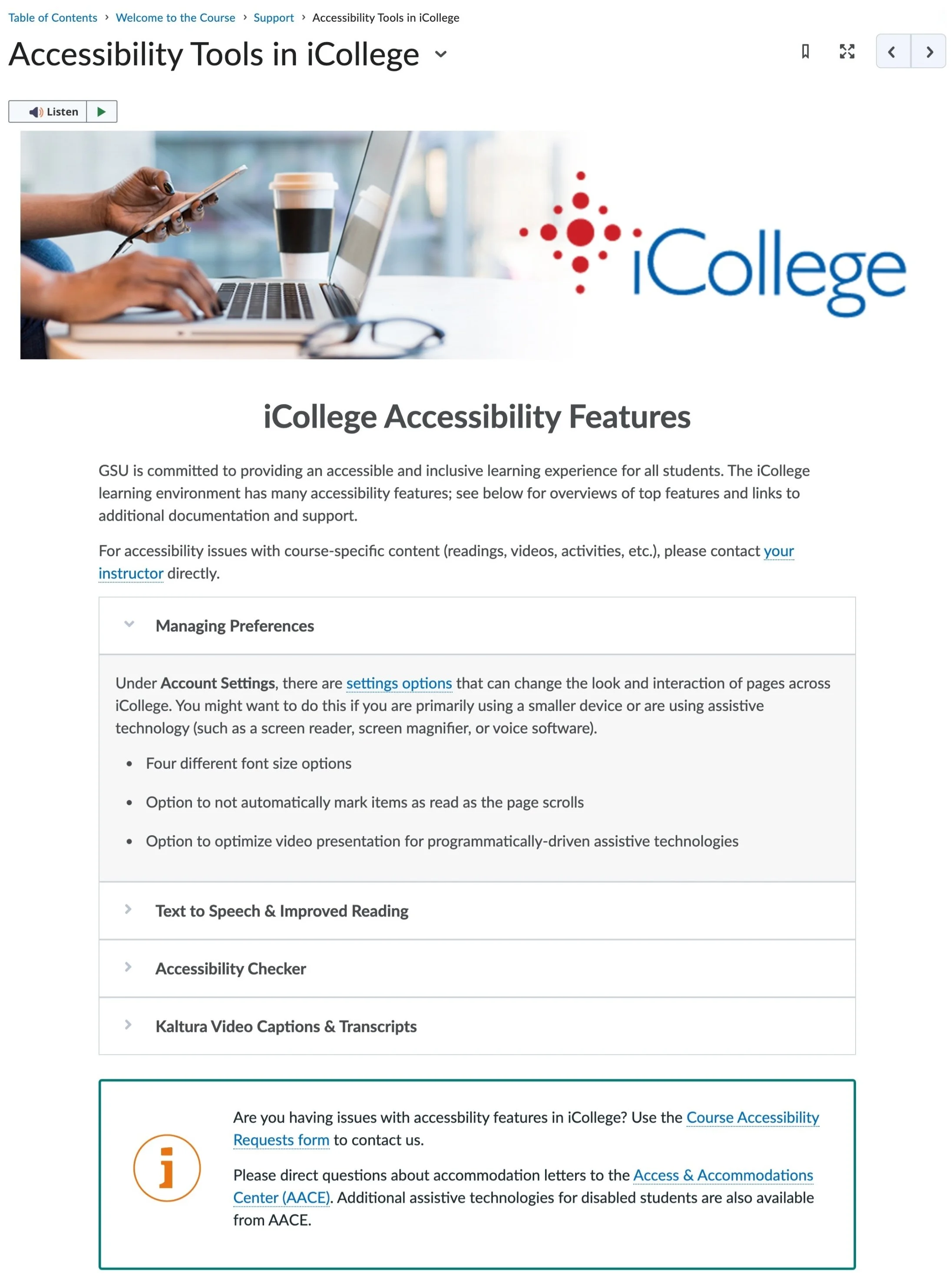 To meet our development schedule, I created this as an HTML page in the LMS, but have since partnered with CETLOE’s communications team to create a resource page on CETLOE’s website that any instructor can link to from their course or that students can access independently. This new webpage also includes helpful information about all the accessibility features available in iCollege and how to access them.