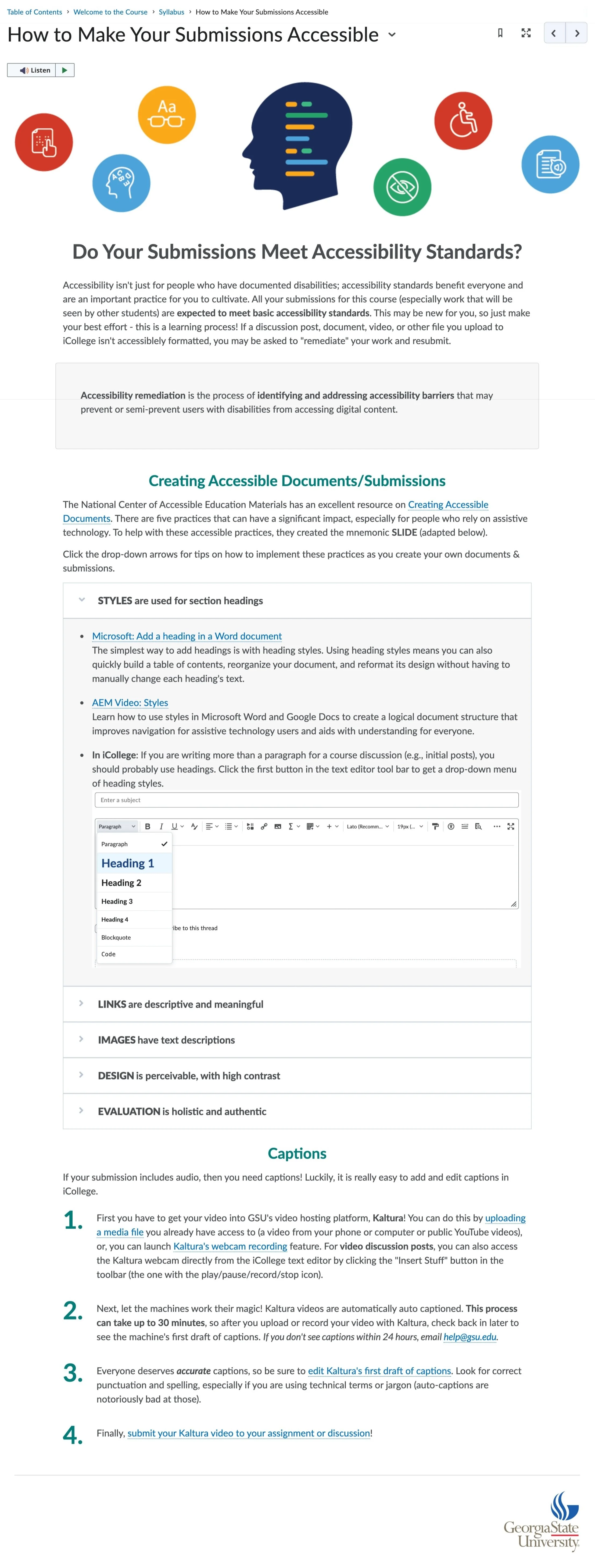 While at GSU, I have led and contributed to a number of resources on creating accessible courses and learning materials, but they were all faculty-facing. In a course with a lot of peer-to-peer discussion and feedback, faculty-created materials aren’t the only, or even sometimes the primary, materials that students are asked to view and respond to. We needed a resource that helped students make their work accessible to each other.
